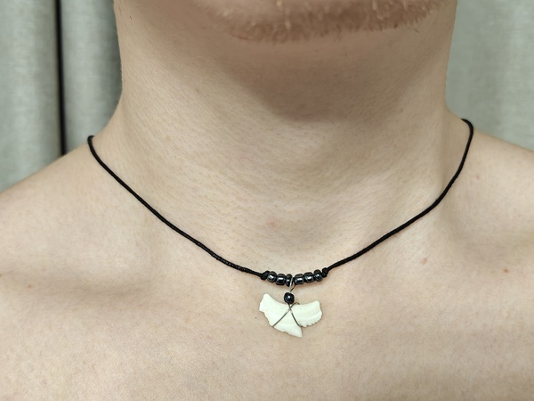 Амулет с зубом Тигровой акулы на хлопковом шнурке с черными бусинами, размер которого минимум - 40 см, максимум- 75 см. Размер кулона 2.5 см