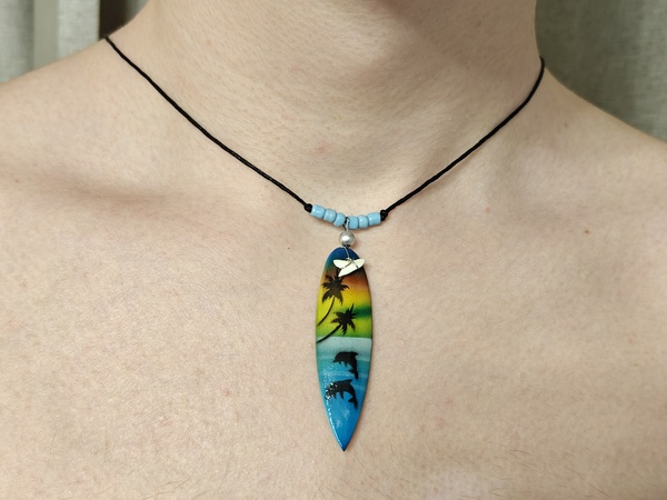 Амулет с зубом  акулы черноперой акулы на доске с  голубыми бусинами на хлопковом шнуре с переменной длинной.