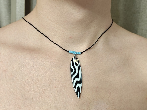 Амулет с зубом акулы черноперой акулы на доске с голубыми бусинами на хлопковом шнуре с переменной длинной.