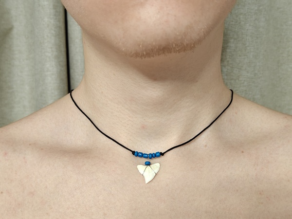 Амулет с зубом Бычьей акулы с синими бусинами на хлопковом шнуре толщиной 1,5 мм с переменной длинной.