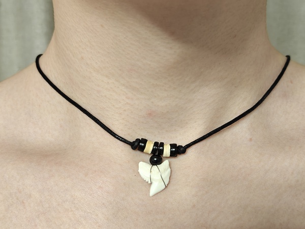 Амулет с зубом Тигровой акулы с бусинами на хлопковом шнуре с переменной длинной.